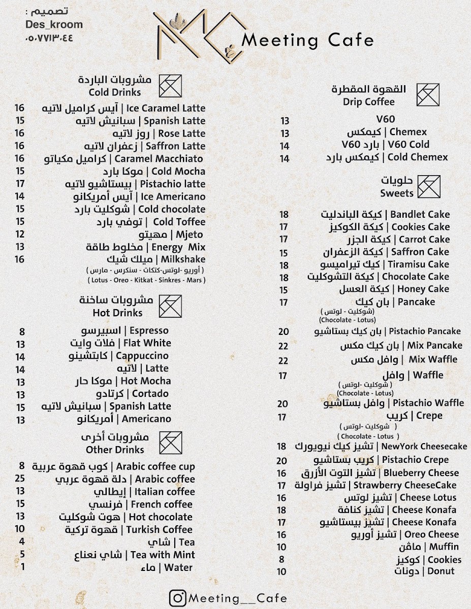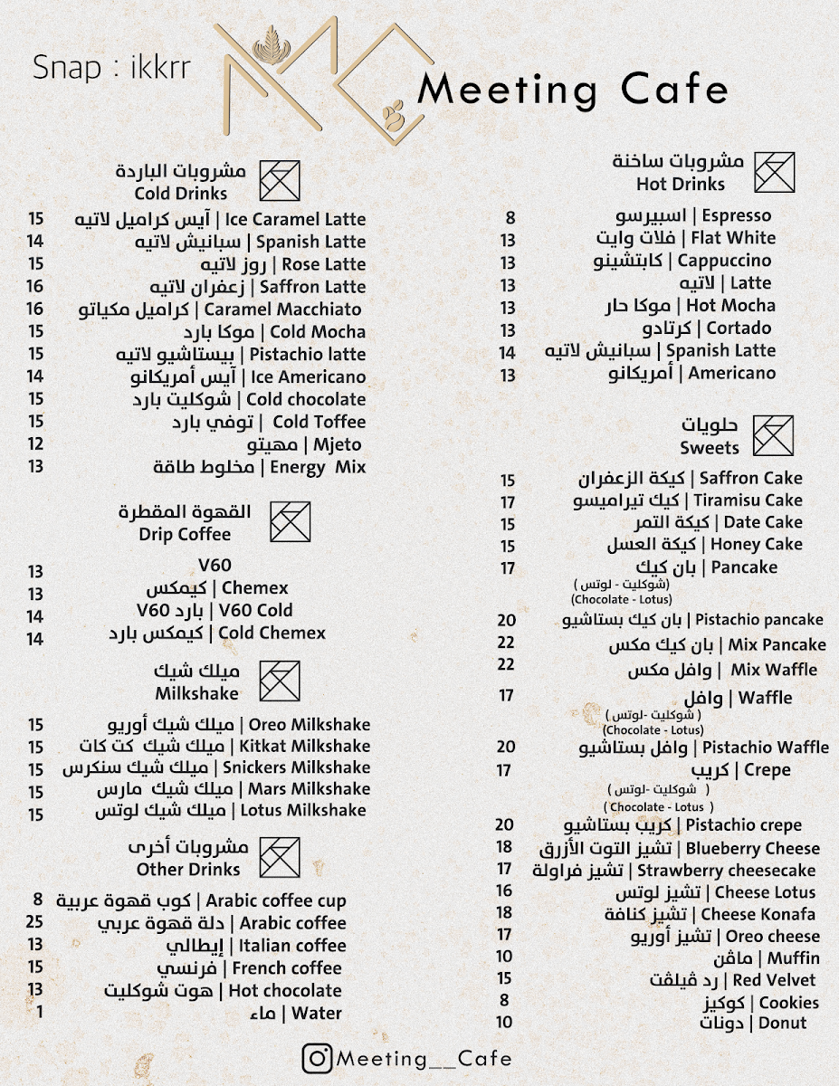 Welcome to Meeting Cafe, an art-infused haven nestled in Al-Riffa, Saudi Arabia. This unique cafe offers a diverse menu featuring an exquisite selection of hot and cold beverages, alongside tempting desserts. As you step inside, the serene ambiance sets a perfect backdrop for indulging in their quality offerings.